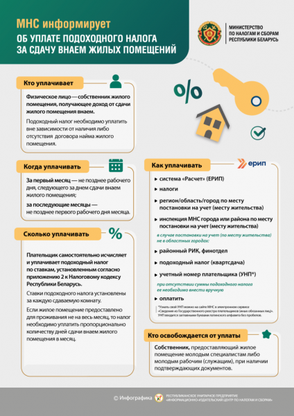Инспекция Министерства по налогам и сборам Республики Беларусь по Центральному району г. Гомеля просит довести до сведения всеобщего обозрения информацию «Об уплате подоходного налога за сдачу внаем жилых помещений» и о том «Что нужно знать о сделках с токенами в 2025 году!»